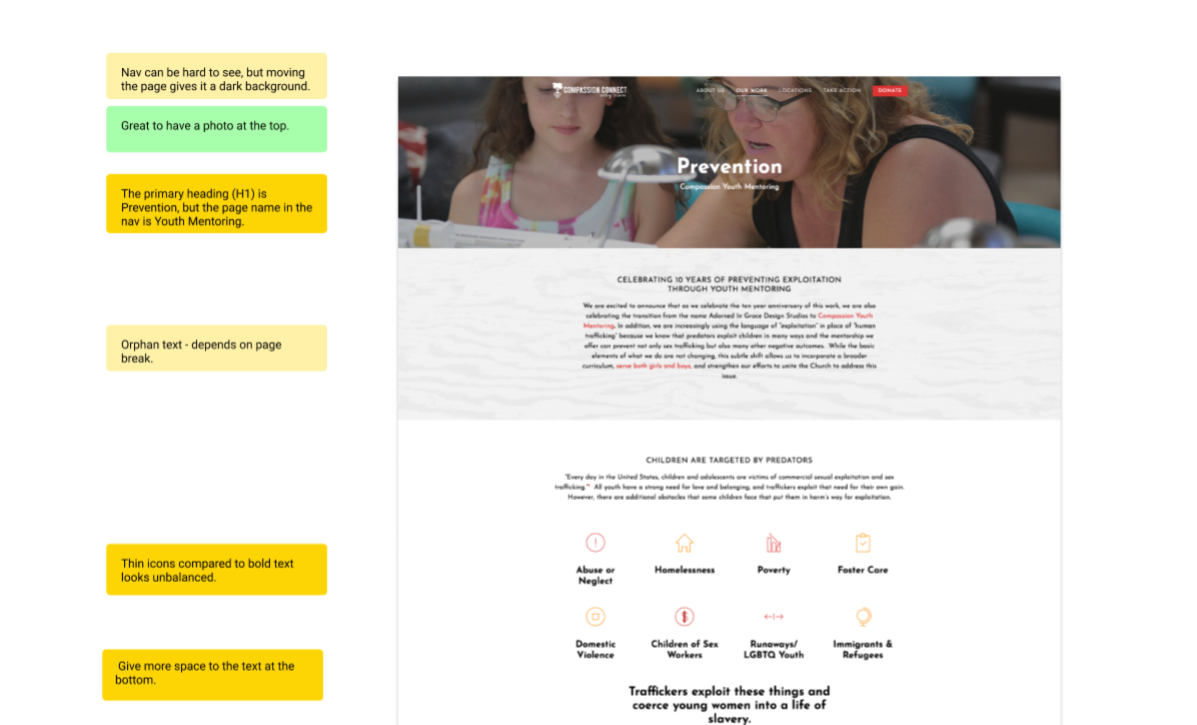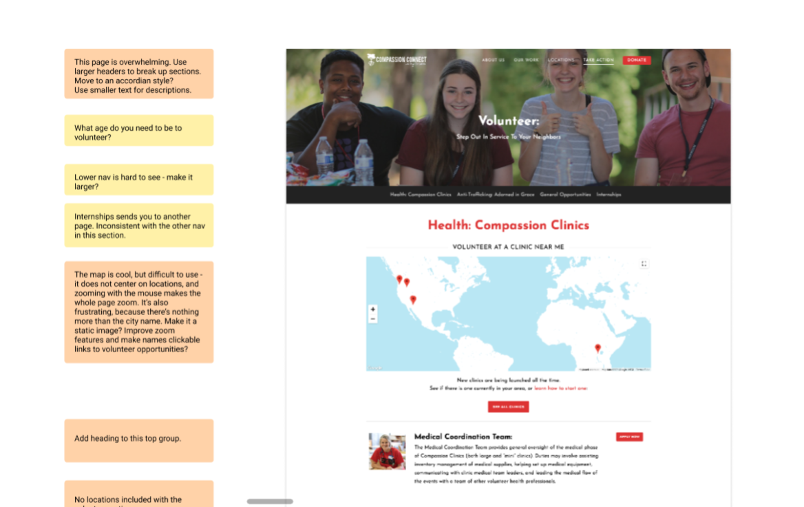 After I struggled to sign up to volunteer with Compassion Connect’s youth mentoring program, I offered to help with the website. Before the first call, I took some time to list out the problems I saw on the pages I had encountered.