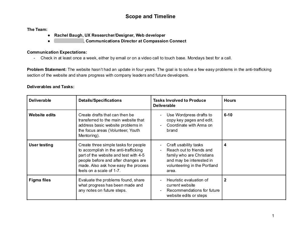I was contacted by someone at Compassion who was happy to meet. They used some of my suggestions right away, and were interested in partnering to make other changes happen. My contact said she built the website, and it had grown with the nonprofit. She was transitioning out of the company, but had six weeks before she left. We made a plan based on that timeline and my ability to volunteer only a few hours a week.